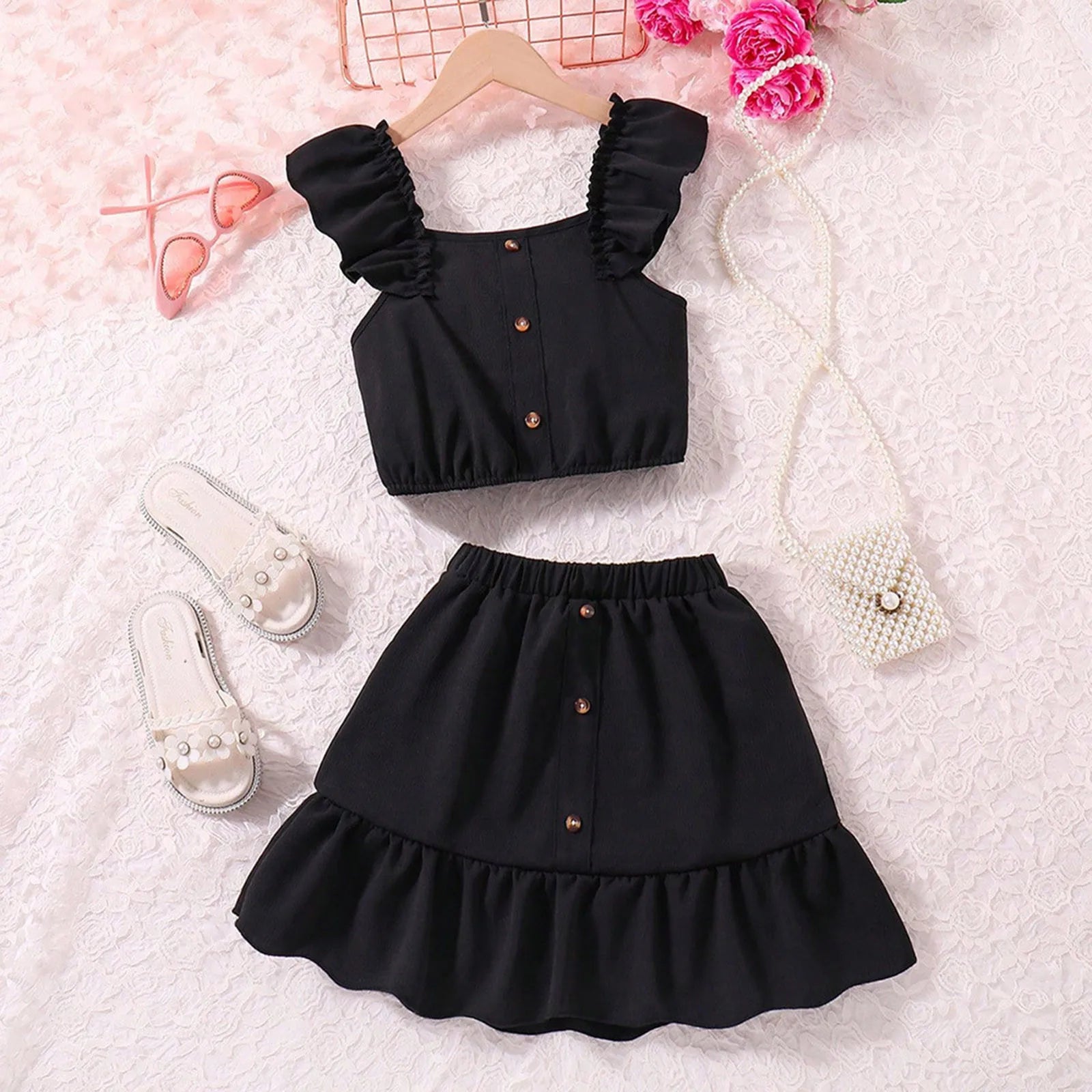 Get ready for some summer fun with this 2pc Ruffle Top and Skirt Set! Perfect for older children, this playful outfit will keep them stylish and cool. Whether they're hitting the beach or just playing outside, this set has got them covered. (No pun intended.)