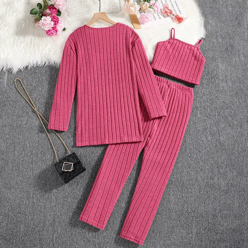 This stylish 3-piece knit set is perfect for older children! With a tank vest, long trousers, and matching cardigan, it's the perfect elegant ensemble for any occasion. Stay cozy and fashionable in this timeless look.