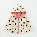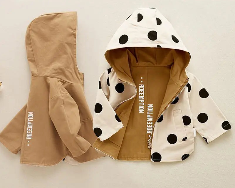 Double your style with this playful and versatile polka dot trench coat. Perfect for those breezy or rainy days, this coat will have your child looking cool and feeling comfortable. A must-have for any fashion-forward kid!
