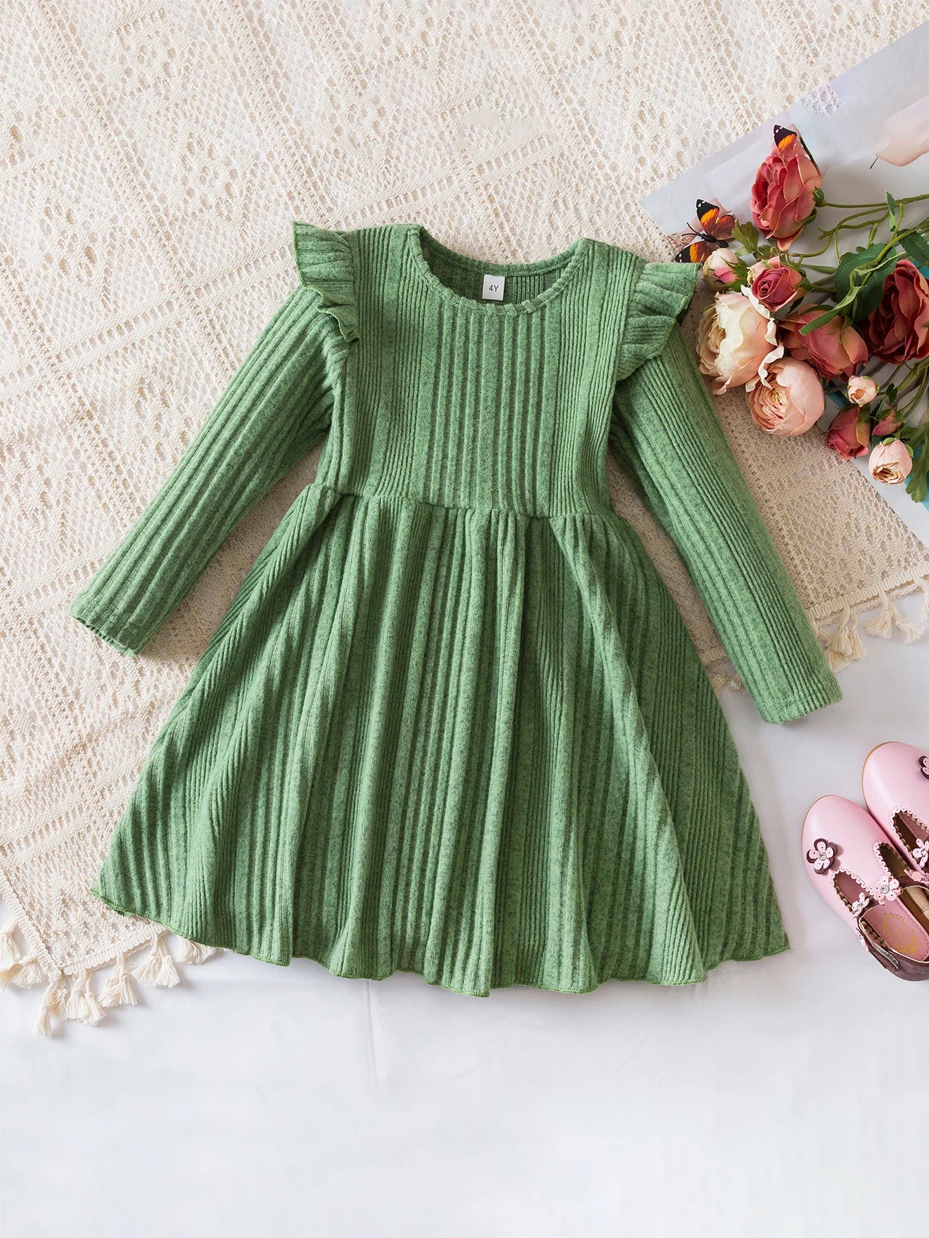 Your little princess will be the star of the season in our Girls Knit Dress! With its fashionable ruffle sleeves, this dress will keep her stylish and comfortable during the autumn months. Perfect for any playful occasion. (Trendy and charming for all her autumn adventures!)