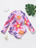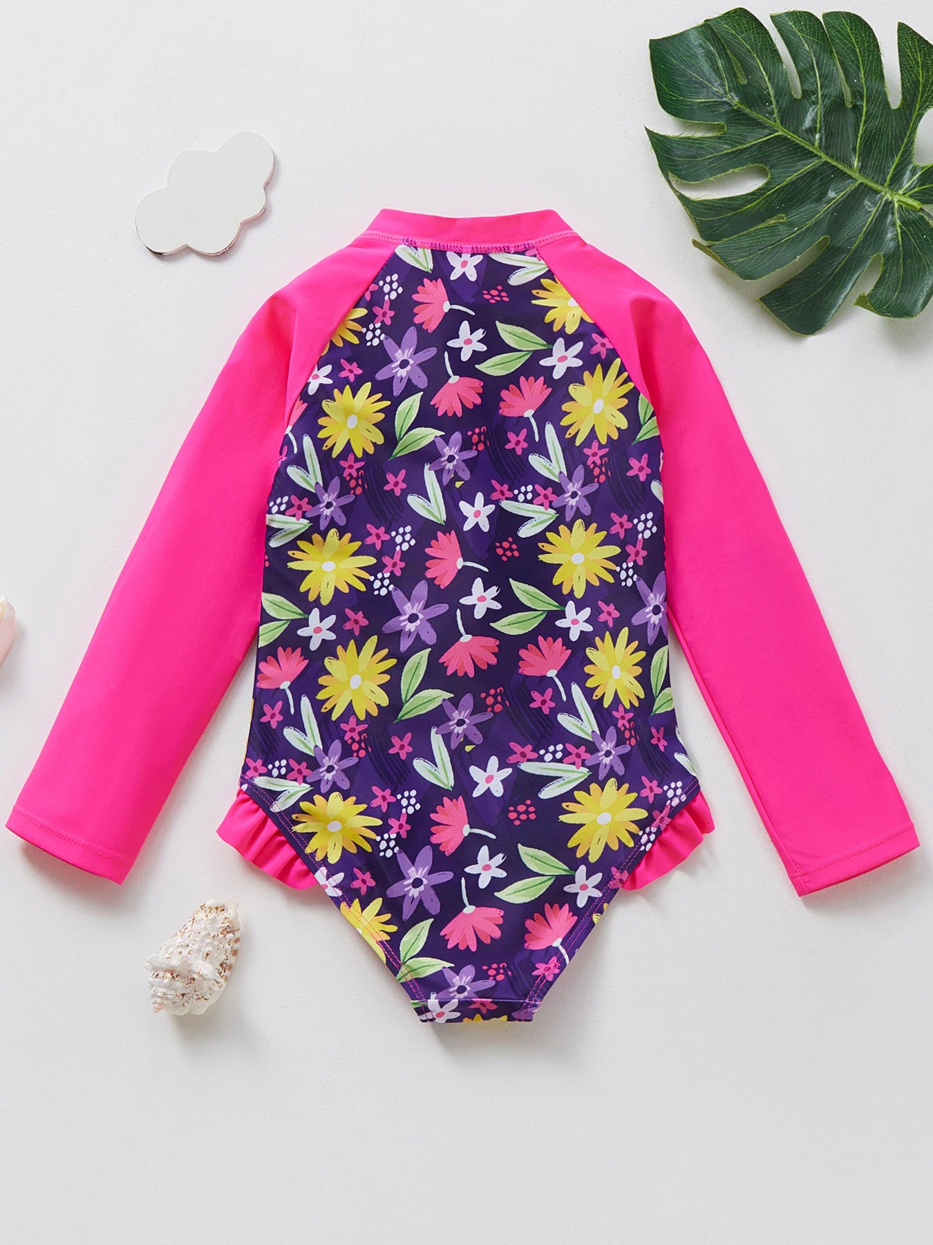 This one-piece rash guard swimwear features a cute ruffle trim, perfect for your little fashionista at the beach or pool. Keep your child both stylish and protected from the sun with this girly swimsuit.