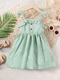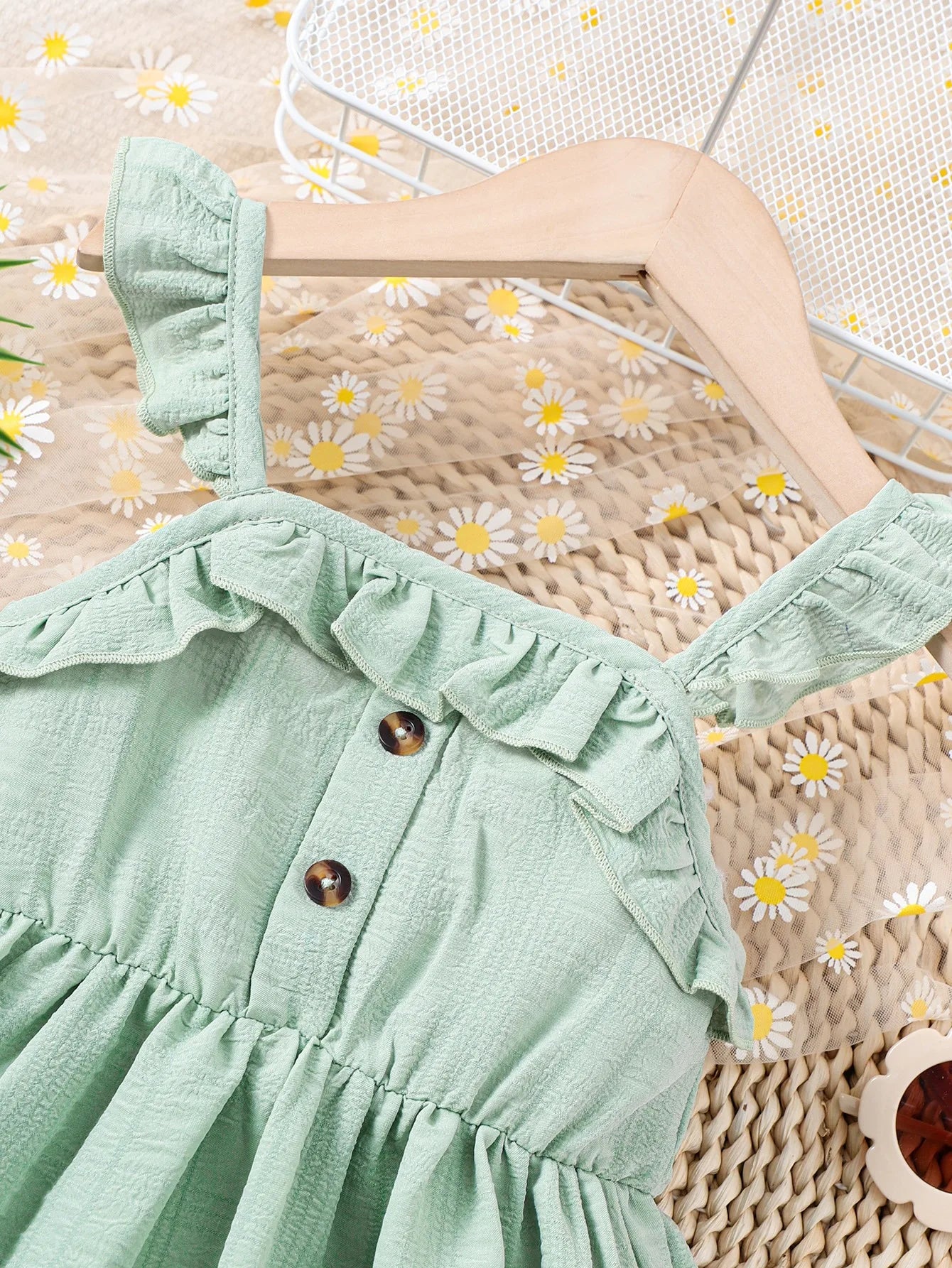 Be the ultimate summer babe in our Solid Colour Fly Sleeve Sling Dress! With its cute ruffle detailing and pastel light green hue, this dress is perfect for all your sunny adventures. Stay stylish and comfortable all season long.