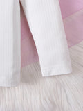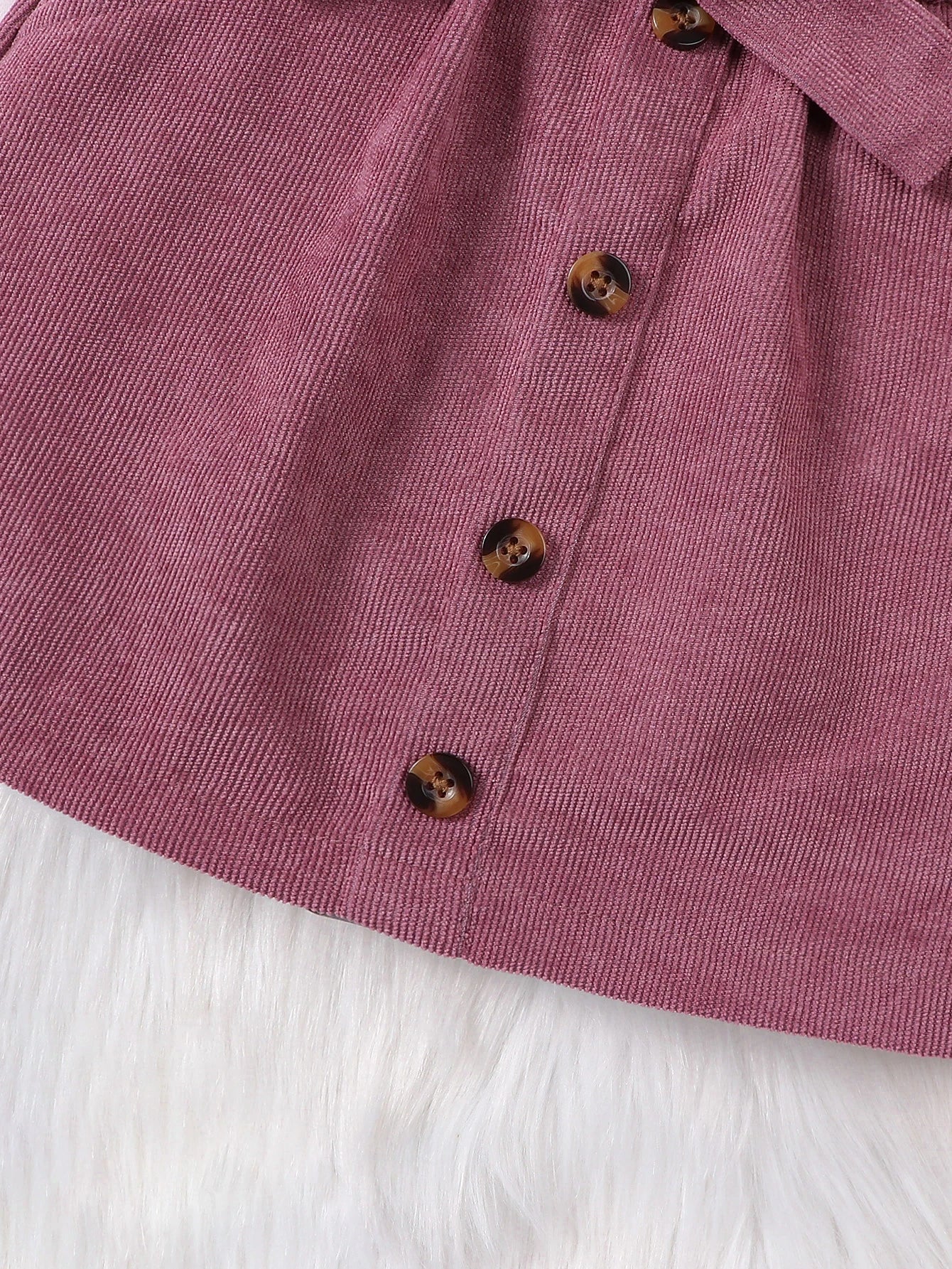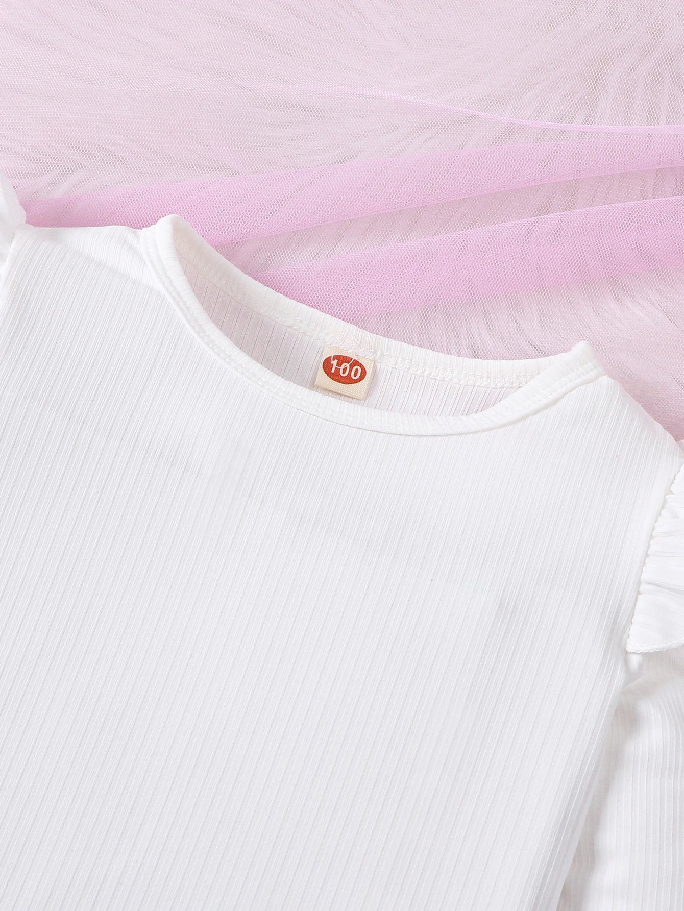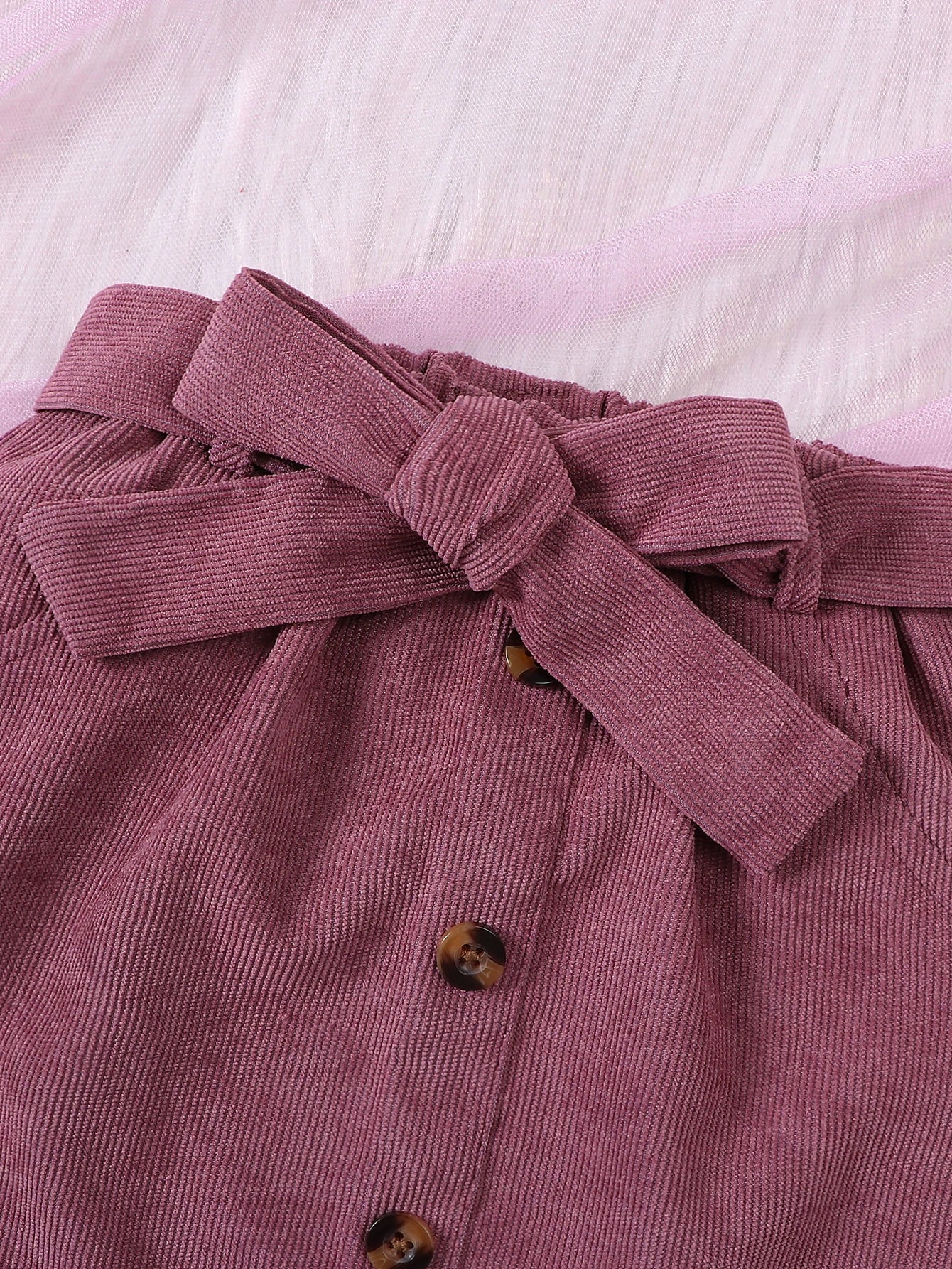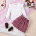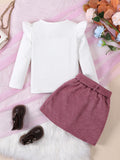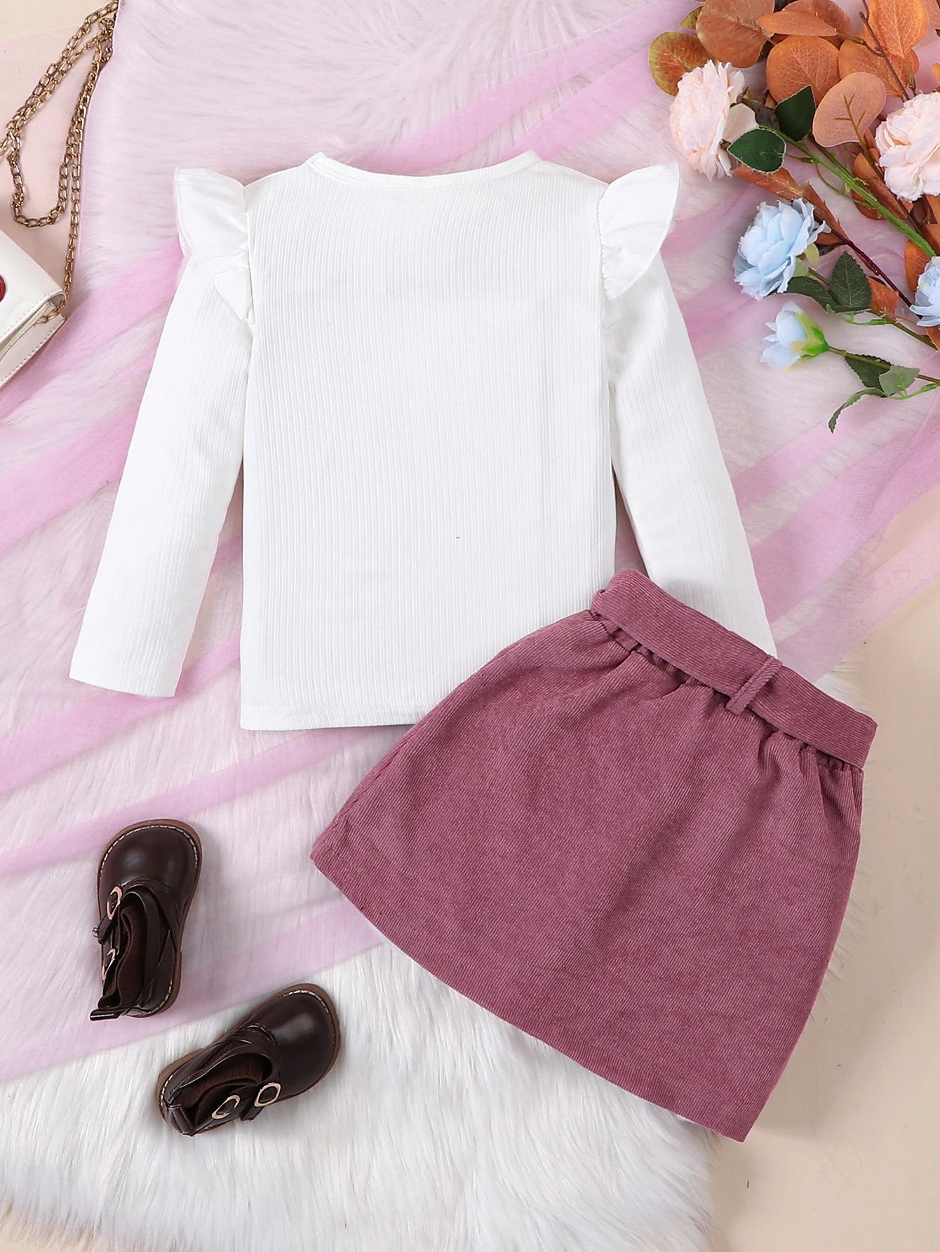 Unleash your child's inner fashionista with this two-piece set featuring a playful ruffle shoulder tip and a trendy belted skirt. The classic white stripes add a touch of sophistication to this fun and comfortable outfit.